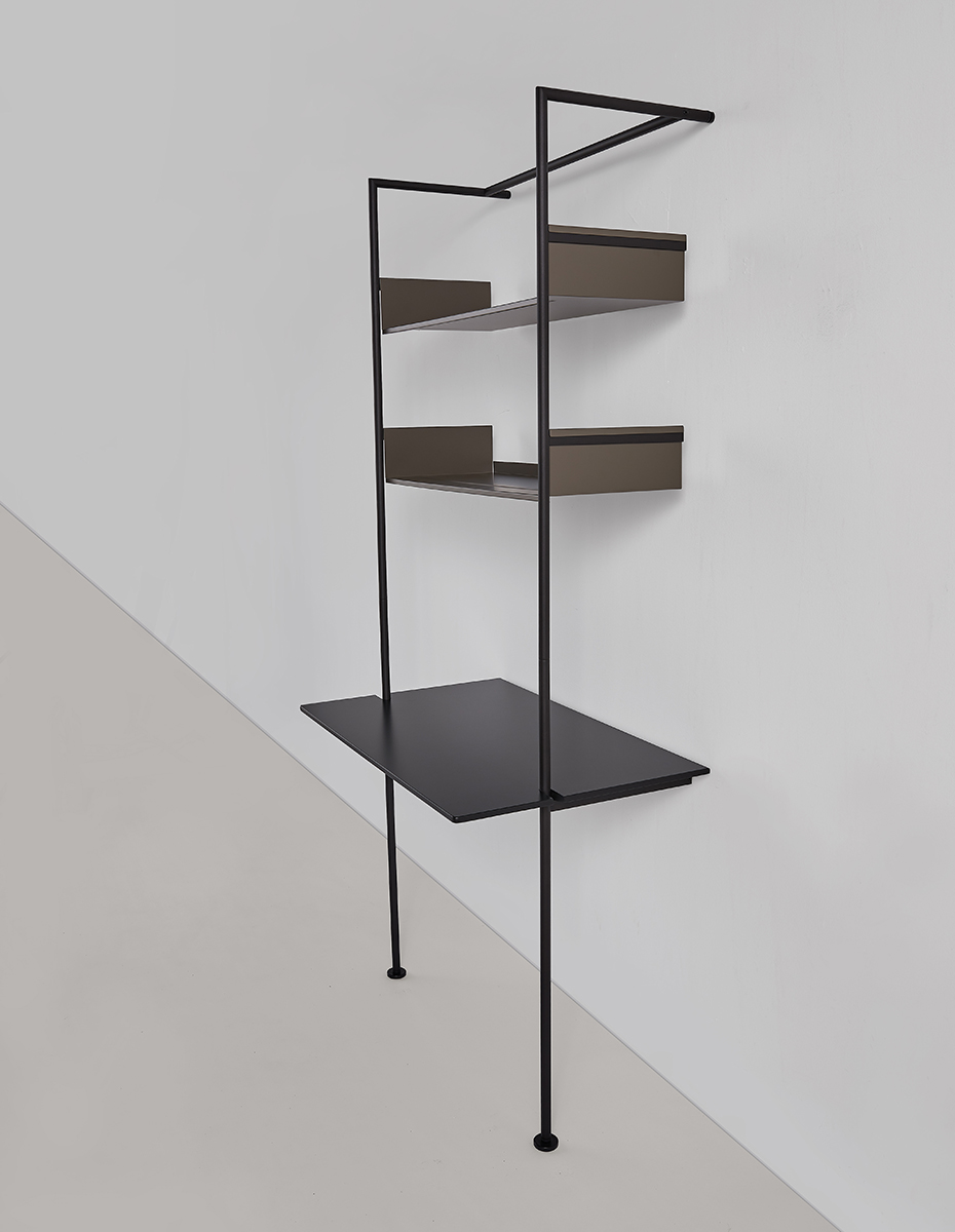 Rahmen schwarz pulverbeschichtet, Arbeitsplatte MDF mit schwarzem Laminat. Tablare aus Stahlblech pulverbeschichtet, in schwarz, weiss, dunkelrot oder fango.