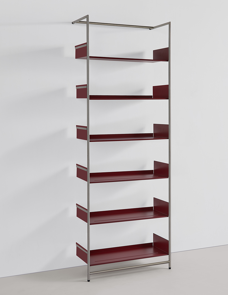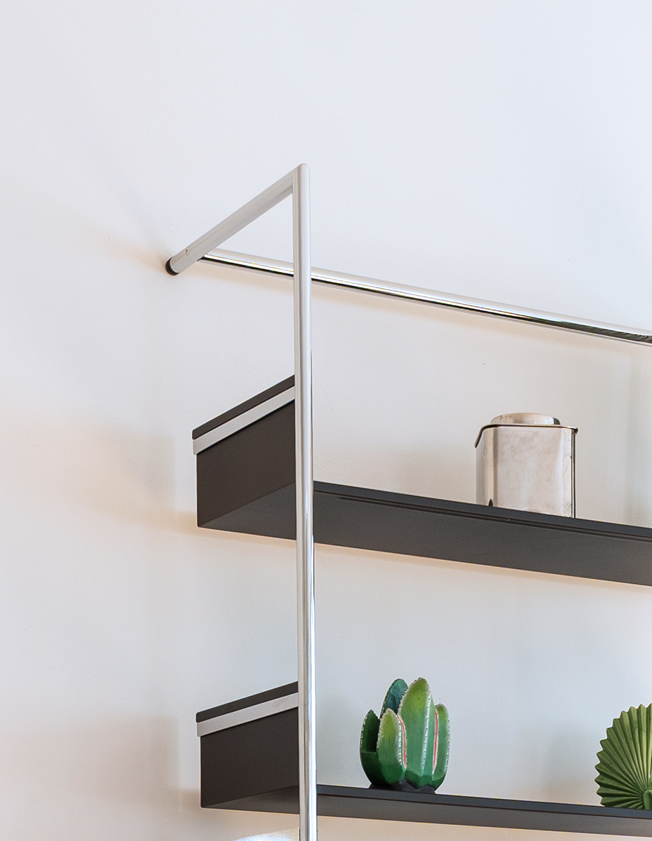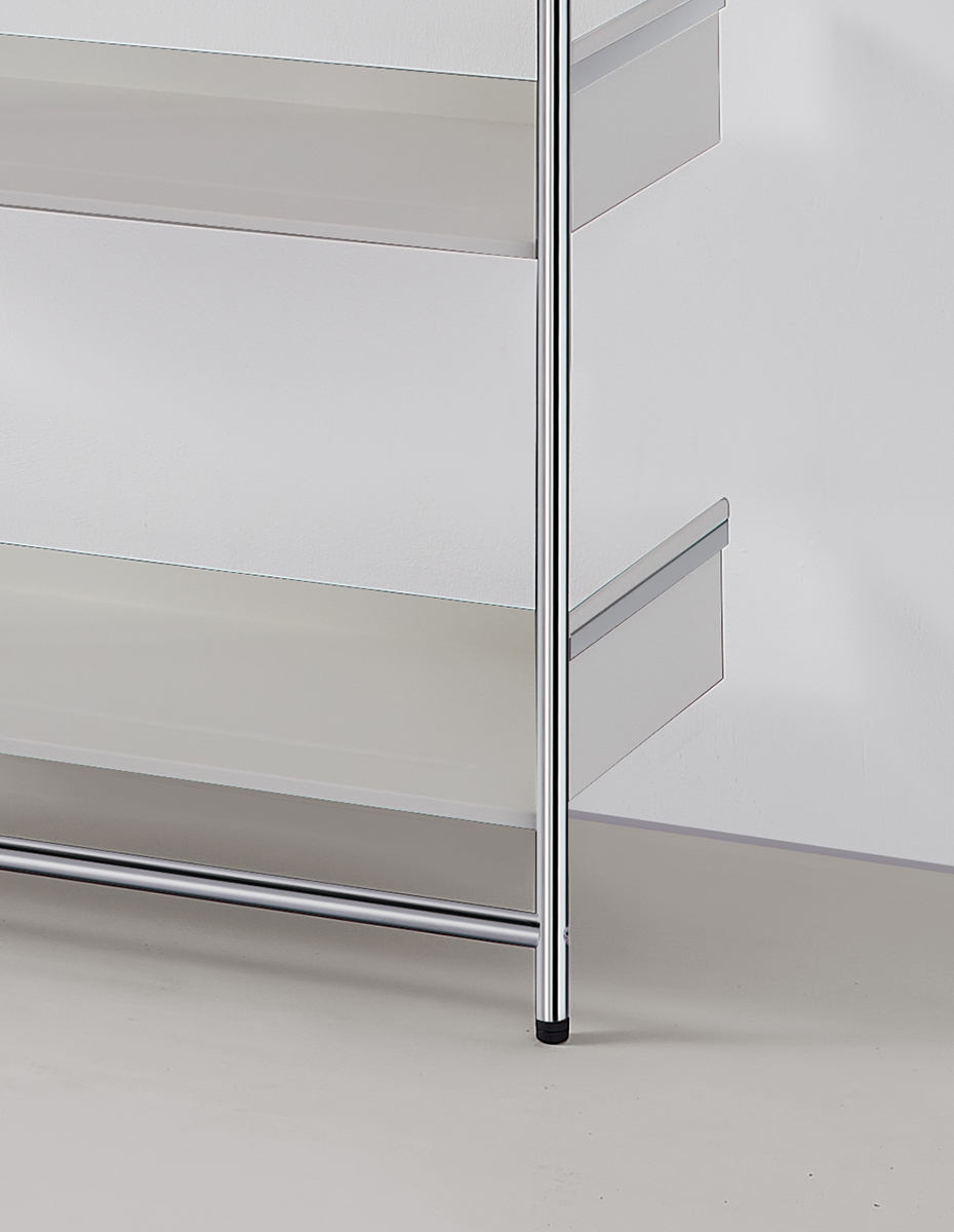Rahmen in chrom glanz, chrom gebürstet oder schwarz pulverbeschichtet. Tablare aus Stahlblech pulverbeschichtet, in schwarz, weiss, dunkelrot oder fango.