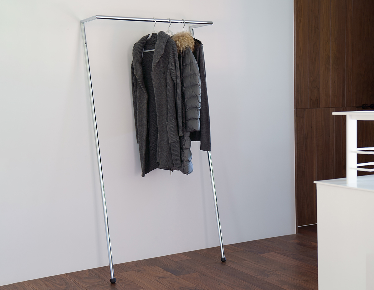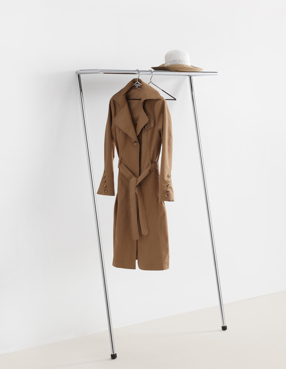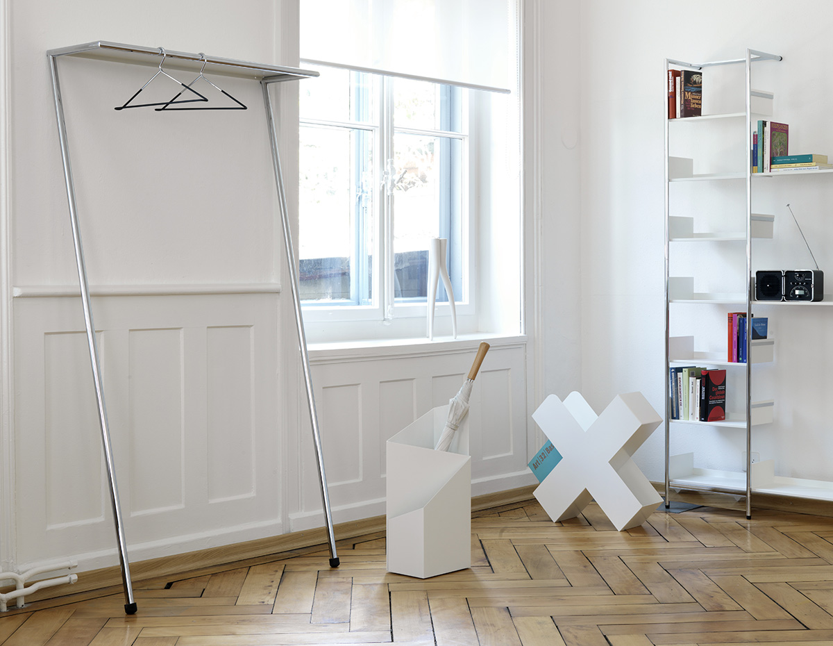 Angelehnt Die Garderobe Zen lehnt sich ohne Montage gegen die Wand. Das oben eingelegte Stahlblech dient als Ablage für Hut oder Tasche. Im Eingang, als Ankleide oder im Büro: Zen passt da, wo es eine Garderobe braucht.