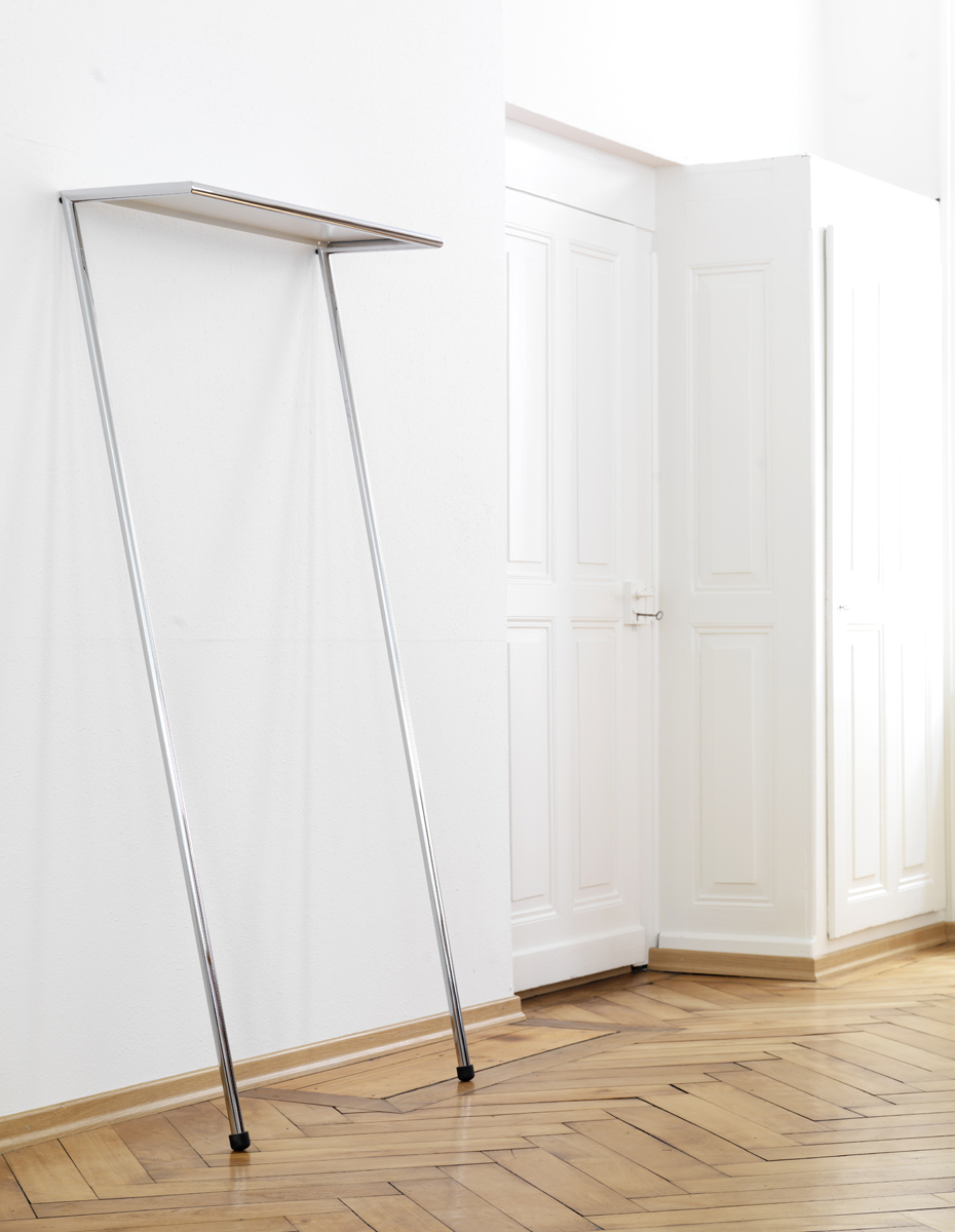Stahlrohr chrom glanz oder chrom gebürstet, mit rutschfesten Gummiabschlüssen, Ablage aus Stahlblech pulverbeschichtet in weiss oder schwarz.